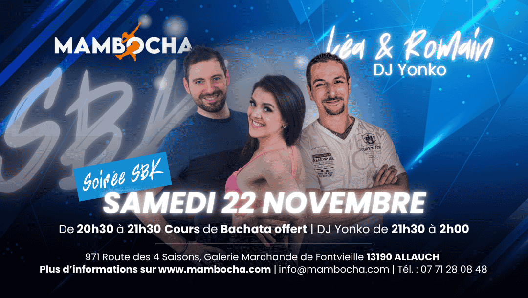 Soirée Salsa Bachata Kizomba 20h30 – 21h30 : Cours évolutif salsa ou bachata avec Léa & Romain.21h30 – 02h00 : Soirée SBK avec DJ Yonko. Tarifs soirée avec une conso soft :12 € en tarif normal10 € pour les adhérents Mambocha ou écoles partenaires (Rock’Caliente, Instant Danse, Buyanga) 2025/20268 € sur présentation de la carte étudiant Lieu :Loca’Dance – Galerie marchande de Fontvieille971 Route des 4 Saisons13190 ALLAUCH Parking gratuit de 150 placesSalle de 200 m² climatisée et avec parquet