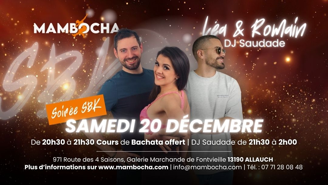 Soirée Salsa Bachata Kizomba 20h30 – 21h30 : Cours évolutif bachata avec Léa & Romain.21h30 – 02h00 : Soirée SBK avec DJ Saudade (Manu). Tarifs soirée avec une conso soft :12 € en tarif normal10 € pour les adhérents Mambocha ou écoles partenaires (Rock’Caliente, Instant Danse, Buyanga) 2025/20268 € sur présentation de la carte étudiant Lieu :Loca’Dance – Galerie marchande de Fontvieille971 Route des 4 Saisons13190 ALLAUCH Parking gratuit de 150 placesSalle de 200 m² climatisée et avec parquet