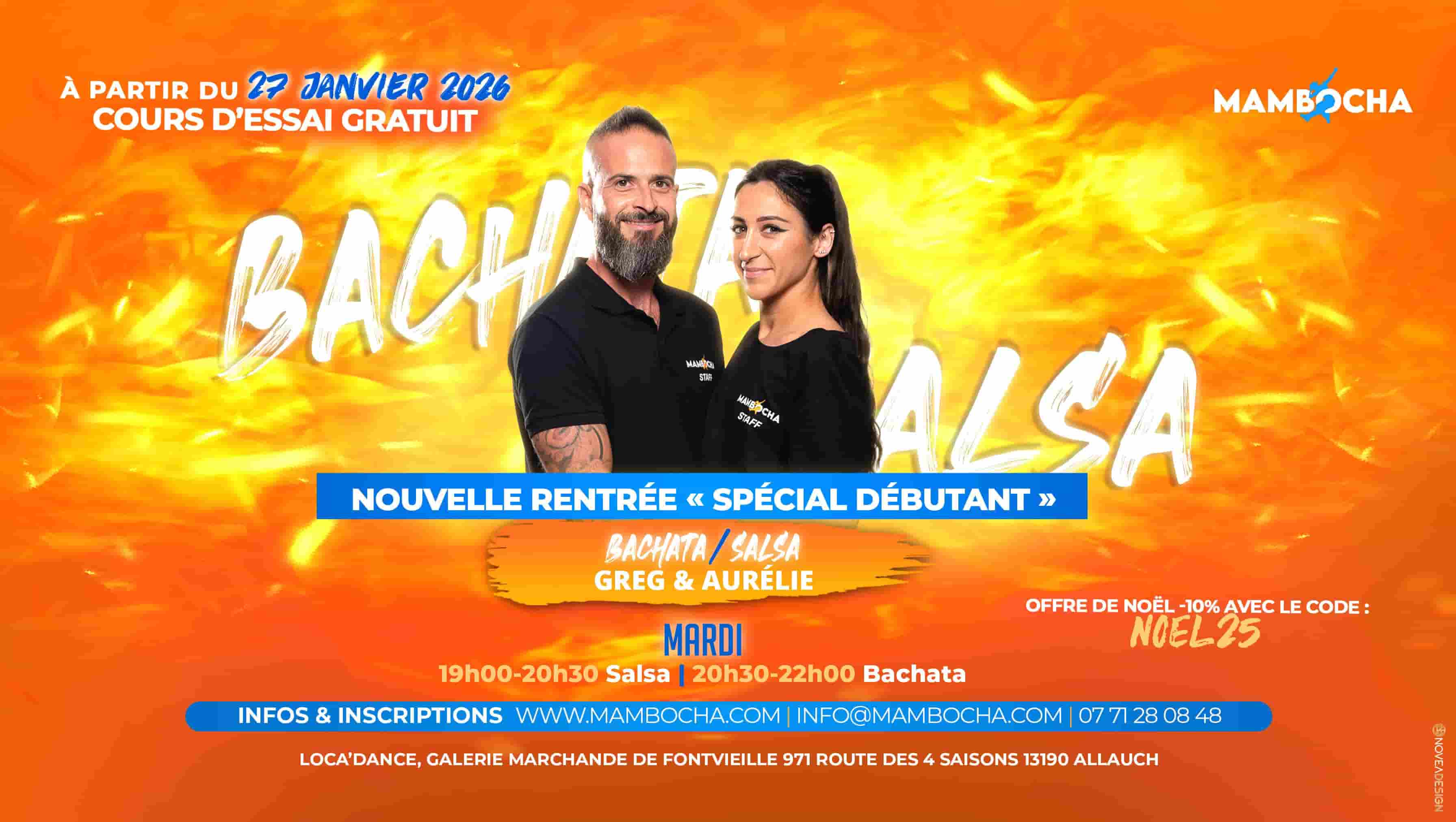 Nouvelle Rentrée Danse Janvier 2026 Toujours voulu danser, mais jamais osé franchir le pas ? Vous avez raté la rentrée de septembre ? Pas de panique, on vous offre une deuxième chance de commencer l’année en beauté ! Cette nouvelle session est spécialement dédiée aux débutants pour vous permettre d’apprendre dans une ambiance conviviale et fun, dès janvier 2026 ! 🎶 A vous de choisir votre style * Salsa Mambo On1 : Mardi, 19h00-20h30 avec Greg et Aurélie * Bachata : Mardi, 20h30-22h00 avec Greg et Aurélie Et parce qu’on adore vous faire plaisir… 👉𝗖𝗢𝗨𝗥𝗦 𝗗’𝗘𝗦𝗦𝗔𝗜 𝟭𝟬𝟬% 𝗚𝗥𝗔𝗧𝗨𝗜𝗧 ! 👉-10% avec l’offre de Noël sur votre inscription (jusqu’au 25 décembre 2025) 🎁 Pas encore décidé ? Venez tester gratuitement ces deux danses le mardi 27 janvier 2026. Une soirée, deux danses, et vous verrez laquelle vous fait vibrer ! ⚡️Attention, places limitées ! 💳 Paiement en plusieurs fois possible 💥 Réduction si vous prenez plusieurs cours ! >🗓️ Les inscriptions ouvrent dès le 24 novembre 2025 ! Alors, prêts à vous lancer ? Tarifs : Offre de noël : -10 % sur votre inscription avec le code : NOEL25 pour toute inscription définitive avant le 25/12/2025. Nouvel adhérent L’adhésion pour la saison 2025/2026 […]