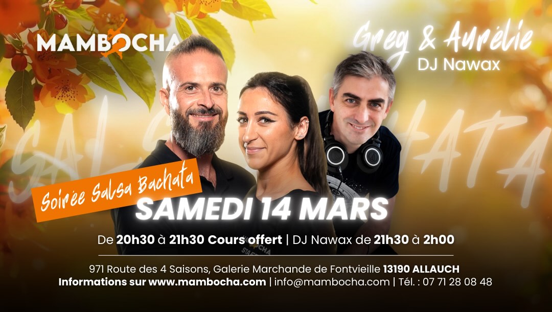 Soirée Salsa BachataSamedi 14 mars 20h30 – 21h30 : Cours de Bachata évolutif avec Greg et Aurélie21h30 – 02h00 : Soirée Salsa Bachata avec DJ Nawax Tarifs soirée avec une conso soft :12 € en tarif normal10 € pour les adhérents Mambocha ou écoles partenaires (Rock’Caliente, Instant Danse, Buyanga) 2025/20268 € sur présentation de la carte étudiant Lieu :Loca’Dance – Galerie marchande de Fontvieille971 Route des 4 Saisons13190 ALLAUCH Parking gratuit de 150 placesSalle de 200 m² climatisée et avec parquet Prochaines dates :Samedi 18 avril 2026Samedi 9 mai 2026Vendredi 5 juin 2026