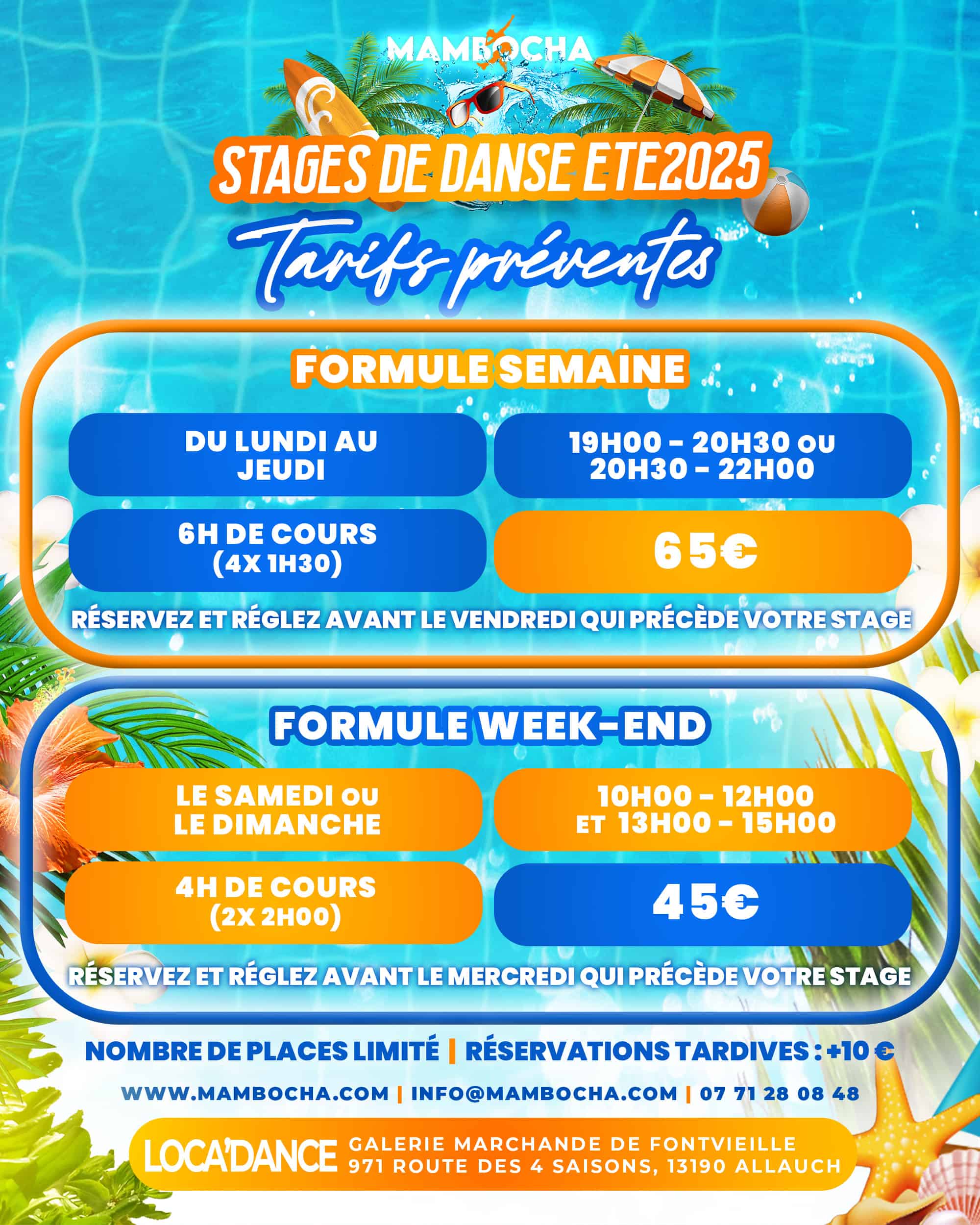 Attention, le nombre de places est limité ! Ne tardez pas à réserver car chaque été sur certains stages nous sommes complets ou en défaut de parité pour les danses à 2. Pas besoin de venir en couple, Mambocha gère la parité. Au plus tôt vous réservez au plus vous aurez de chance d’avoir votre place.